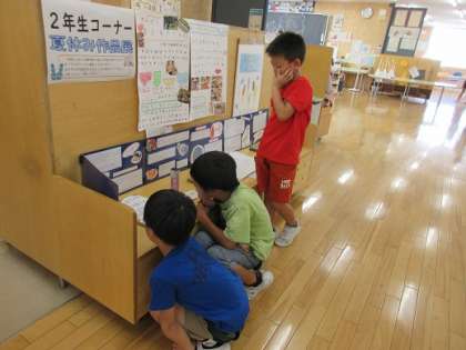休み時間には、作品を仲間と話しながら興味をもって見ている子どもがたくさんいます。また、高学年では研究者さながらの様子で、研究の経過やその結果について熱く説明してくれるなど、とても頼もしい姿があちらこちらで見かけられます。