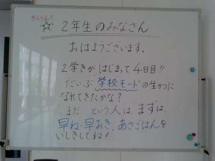 登校した子供たちはホワイトボードの学年担任からのコメントを読んだり、その日の予定を確認したりして、教室に向かいます。