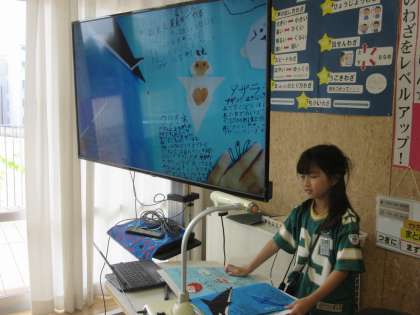 夏休みに取り組んだ自由研究の作品の自分なりの「こだわりポイント」や工夫、また苦労話を紹介し合っています。友達の取組の凄さに驚いたり、作品を見るだけでは分からなかった「こだわりポイント」を知って感心したりする様子が見られました。