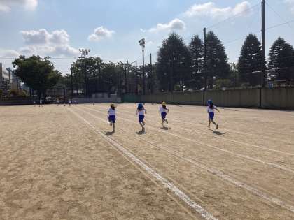 50m走を外で走りました。子供たちは、走る際の構えを何度も確認し、少しでも記録が伸びるように頑張りました。