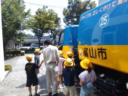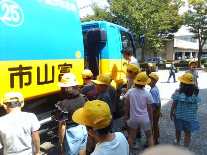 回収員の方の説明の後、ゴミ収集車の観察をしました。ゴミ収集車周りをよく観察し、気になったことは進んで質問しました。収集車の工夫に迫ろうとする姿がありました。