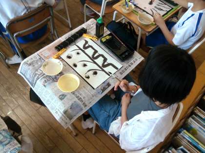 9月4日(水)、図画工作科では「墨と水から広がる世界」の学習を始めました。まずは、墨の濃淡をグラデーションで表してみたり、「かすれ」「ぼかし・にじみ」をつくってみたりしました。