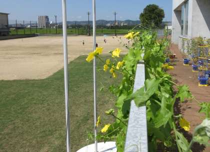1学期に植えたヘチマが猛暑をものともせず、2階までその蔓を伸ばし、生き生きと花を咲かせています。