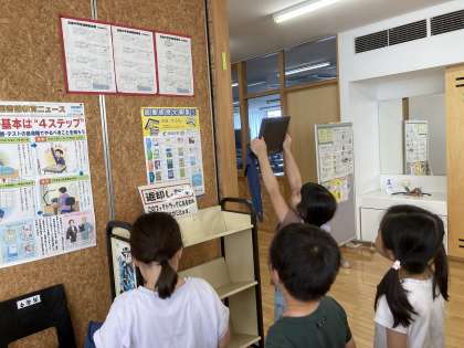 国語科の学習では、文字の大きさ、色、言葉の量、絵の使い方の4つの視点で、校内で工夫されているものを探しました。一人一台端末で撮影するのが嬉しくて、意欲的に探す子供たちでした。