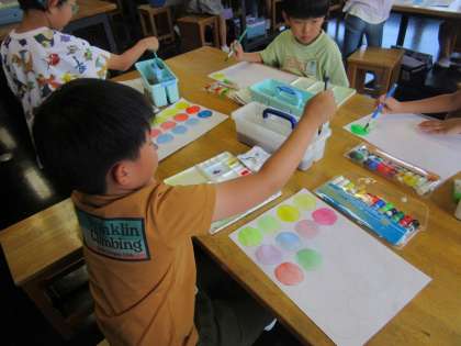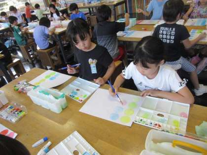 図画工作科では、みんなが大好きな「にじいろのさかな」の絵本の世界観を絵で表すことに挑戦しています。「こんな魚に会ってみたいな」と思う魚を想像し、描きます。鱗を一枚、一枚丁寧に塗り、素敵な魚の完成を目指して、作品づくりに取り組んでいます。