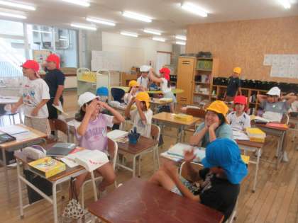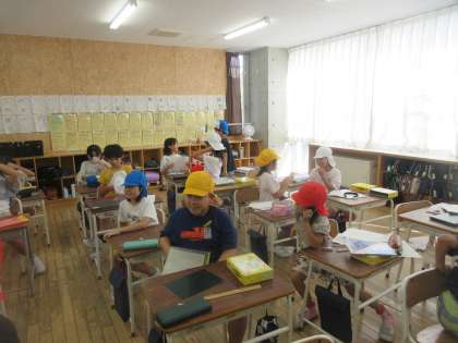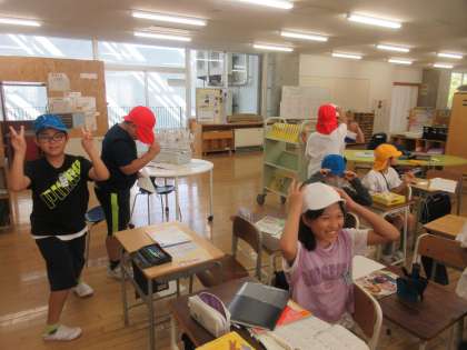 2学期から使用する色団帽子を配りました。熱中症対策のために耳から後頭部にかけてフラップが付いています。新しい帽子をかぶった子供たちはとても嬉しそうでした。