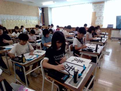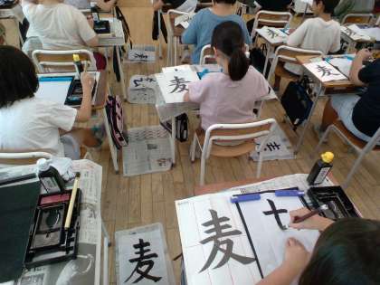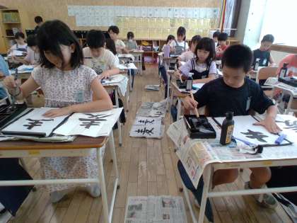 「もっと右上がりだった」「はらいを伸ばさないと」と改善点を見付け、落ち着いて練習をしていました。
