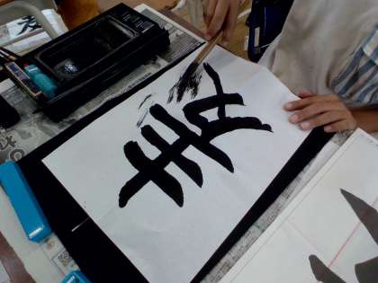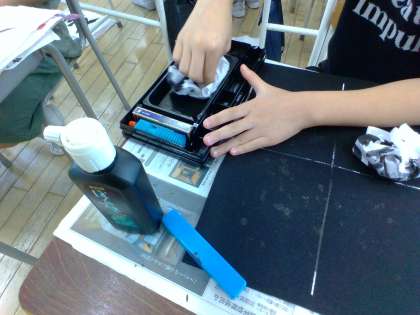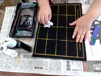 書き終えた後の片付けも、墨で汚れないように、とっておく半紙以外で筆の墨をとり、硯を拭き、下敷きも墨のついていないところを使ってきれいにしています。