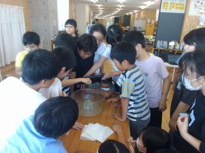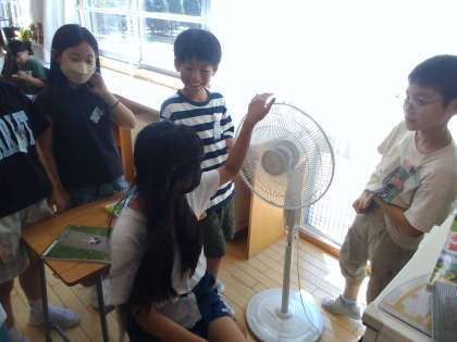 台風のことについて自分の問いをもち追究しています。台風の仕組みを知りたいと実験してみたり、扇風機を使って風の強さを調べたりするなど、自分の問いを解決するために様々な方法で調べて追究することができました。