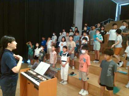 区域連合音楽会に向けて、低音部では、響き声で会場いっぱいに声を出すための練習をしました。本番のオーバード・ホールの会場をイメージして、気持ちを込めて歌っています。