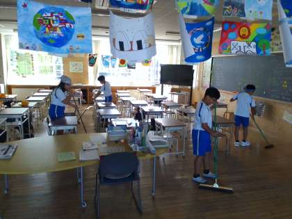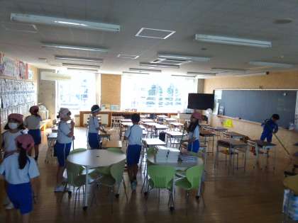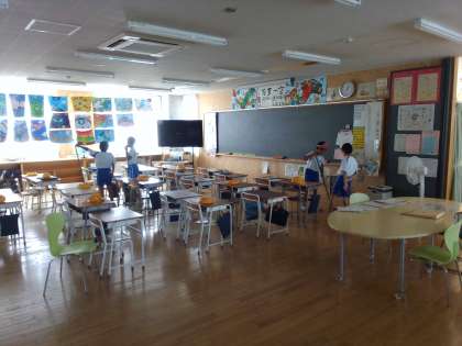 今日は6年生がチャレンジ陸上に参加しているため、午後からいません。5年生は6年生の代わりに最高学年です。いつもお世話になっている6年生のために何かできることはないかと考え、6年生の教室を掃除しています。