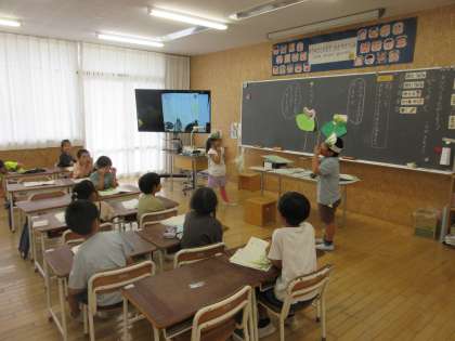 国語科「やくそく」のおはなしを、ペープサートや役割演技をしながら、その世界を楽しんでいます。