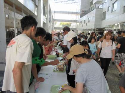 提供品販売や飲食コーナーに、たくさんの保護者や子どもたちの姿が見られます。