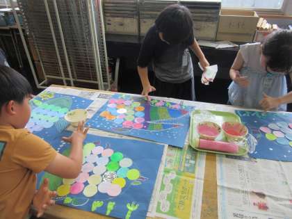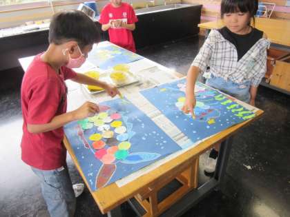 図画工作科「にじいろのさかな」の学習では、「こんな魚に会いたいな」と思う魚を丁寧に描いています。その魚がどんな海に住んでいるのかを想像しながら、深海の生き物や植物をとろとろ絵の具で彩色しました。とろとろ絵の具のねっとりした感触と淡い色合いの組み合わせを楽しみながら、指を使って描きました。完成した作品をみんなで鑑賞するのを楽しみにしている子供たちです。