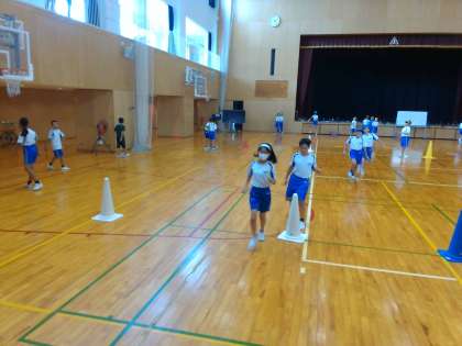 体育の学習では、リレーについて学習しています。全速力でバトンをつなぐために、どのような受け方をすればよいのか考えながら練習しています。バトンパスをしている動画をとり合い、分析しながら何度もバトンパスの練習をしました。