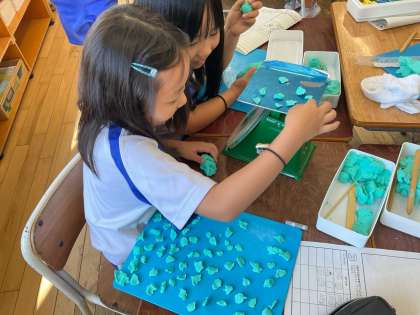 理科の学習で、同じ重さのねんどの形を変えると、沈んだり浮いたりする実験をきっかけに、子どもたちは、形が変わると重さは変わるのかという、問いをもち、追究を始めました。重そうな形、軽そうな形を考えながら100グラムの粘土をいろいろな形に変えて実験を始めました。