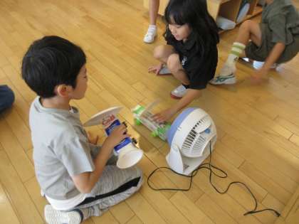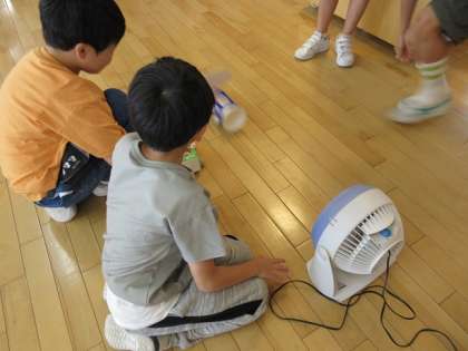 2年は、生活科で作った風で動く車を思い思いに走らせていました。
