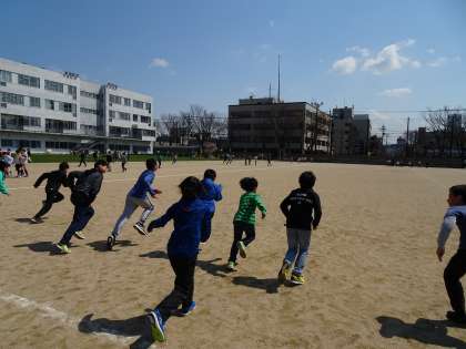 4月10日休み時間の様子です。学年ごとに割り振られた場所で100mダッシュをする子供が見られました。「みんなと走れて楽しかった」と、友達といっしょに運動する楽しさを覚えた子供たちでした。