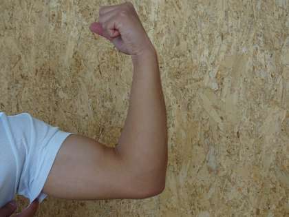 自分のうでをさわって、骨と筋肉のある部分や、うでが曲がる関節の部分を曲げのばししたときの筋肉の様子を調べてみましょう。かたさややわらかさなどに気づけるかな。