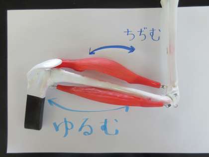 うでを曲げたときは、伸ばしたときとは反対に、うでの上の筋肉が縮んで、下の筋肉がゆるみます。