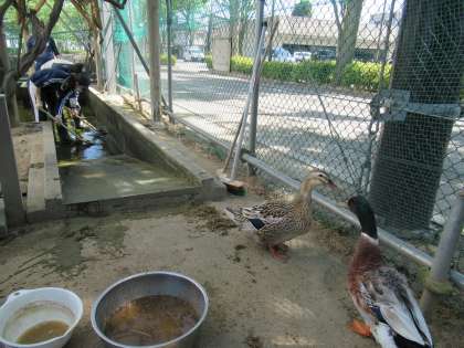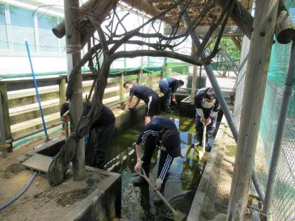この好天続きで、カモの池はすっかり緑色ににごってしまいました。グミとビスケットもこの暑さに少しまいっているような・・・そこで、きれいな水の中で泳いでもらいたいと、先生たちで池の大そうじをしました。池の水を全てぬいて、底にたまった泥を取り除きました。その後デッキブラシやたわしで底や側面をみがくと見ちがえるようにきれいになりました。