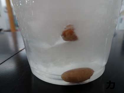 観察3 発芽に空気は必要かな?〔左の写真→オ(空気あり)、右の写真→カ(空気なし)〕