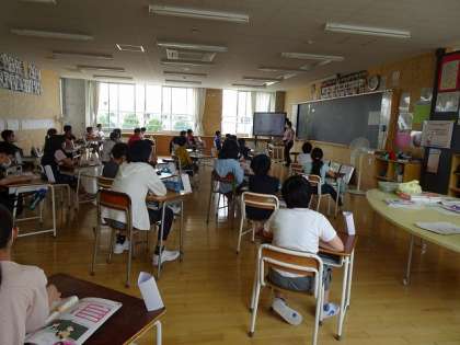 外国語活動の様子です。子供たちはアルファベットの発音を聞く活動を中心に行い、まぎらわしい発音を聞き分けようとしていました。