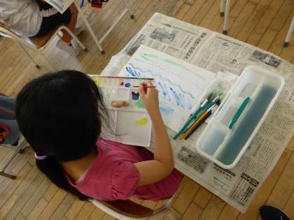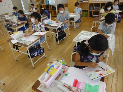 図画工作科では、絵の具を混ぜたり、水の量を変えたりしながらいろいろな色を作りました。作った色を試しながら、画用紙に思いのままに描きました。思いに合う表し方を工夫し、作品作りを楽しむ子供たちでした。