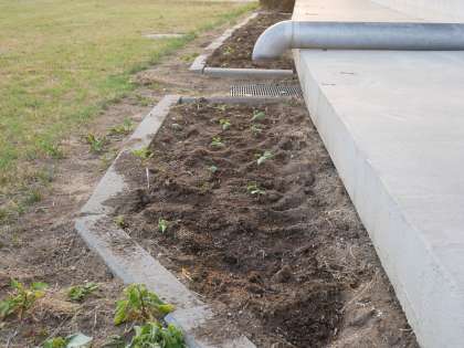 休校期間中に植えたヘチマの種はすっかり成長し子葉が生えてきたので、以前作った会議室前の畑に植え替えました。これからは4年生全員でお世話をしていきますよ。成長が楽しみですね。