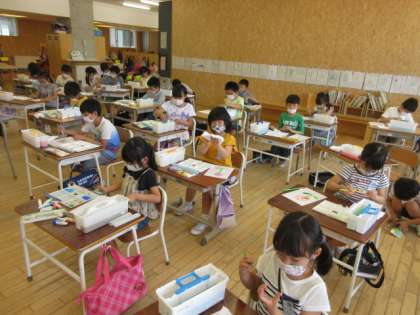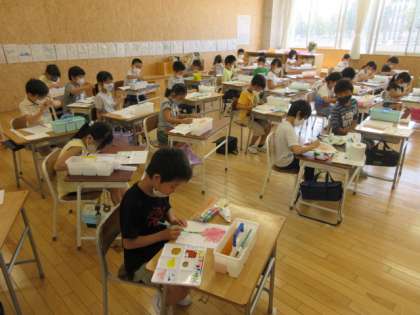 今日は、クレヨンと水彩道具を使って、「ぼく・わたしの○○たんぽぽ」をかきました。