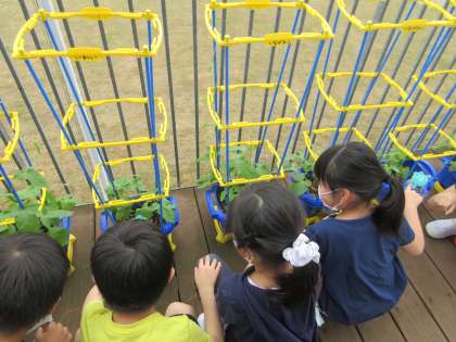 毎日様子が変わるあさがおを大切に育てていきたいなと願う子供たちです。