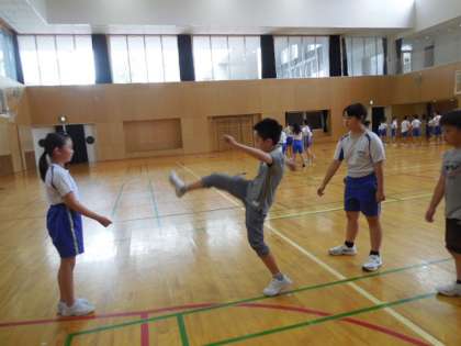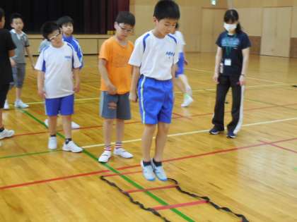 今日は、体育館で走り高跳びの学習を行いました。ウォーミングアップに縄跳びとラダーをして体をほぐしました。それから、ゴムひもを使って、一歩助走で跳び越す練習をしました。
