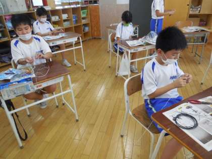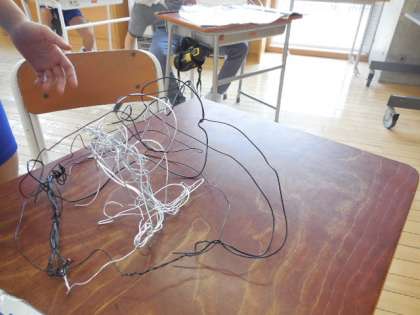 5年生は、図画工作科の学習で針金を用いた立体作品づくりに取り組んでいます。ペンチを使って、針金の長さや形を自在に変え、思い思いに取り組んでいます。