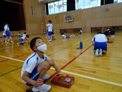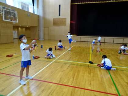 理科「電流のはたらき」の学習で、直列回路や並列回路について学習をしてきました。学習を終えて、最後に体育館でプロペラを飛ばしました。直列回路と並列回路では、プロペラの飛び方が違うことを感じながら、飛ばしたプロペラをキャッチしたり、高く遠くまで飛ばそうと工夫したりしていました。プロペラが飛ぶ様子をうれしそうに眺めながら、楽しくてたまらない様子で何度も飛ばしていました。