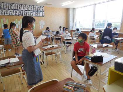 友達と3人グループになって、質問をしたり記録をしたりして、友達の話を聞く学習をしています。密に気を付け、今日は、相手の情報収集を行いました。