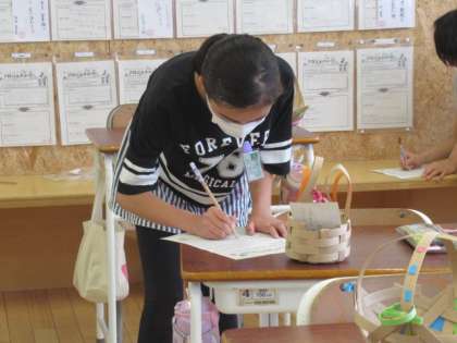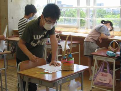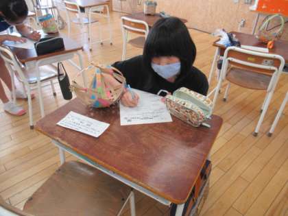 完成した作品について、工夫したところを発表しました。その後、配色や紙バンドの太さ、編み方の工夫について、友達の作品のいいところを探して鑑賞しました。生活で使える、すてきなかごができました。