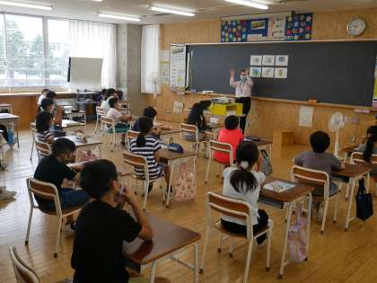 ALTの先生と楽しく進めています。今日は天気の尋ね方や答え方を勉強しました。発音をしっかりしようと、ALTの先生の発音をよく聞き、真似しようとする子供たちです。