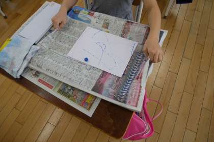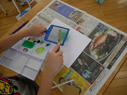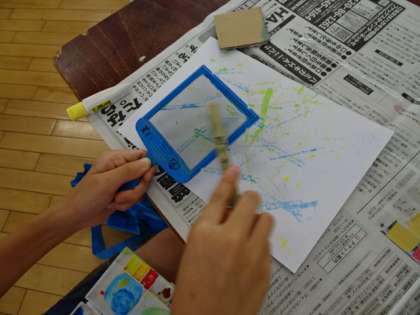 図画工作科では、段ボールやビー玉、ストローなどの道具を使って様々な模様を作りました。子供たちは、きれいな模様ができ楽しそうな様子でした。