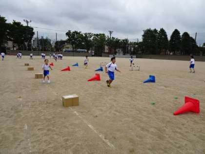 体育の学習で、ハードル走に取り組みました。間隔や、跳び越える物の違うコースをいろいろと試しながら、自分に合った間隔のコースを探しました。そして、3歩で跳び越えること、踏み切りの足をそろえることを目当てにがんばりました。