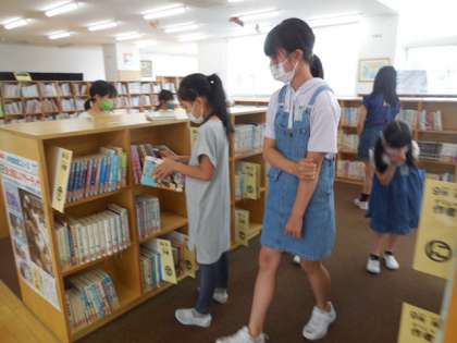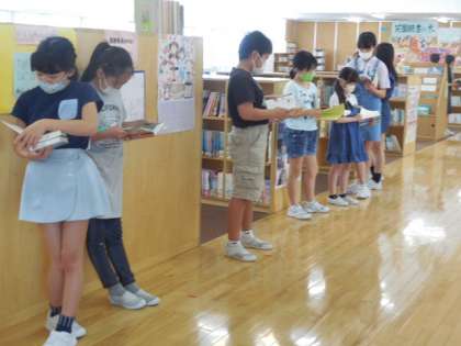 今日は学級でそろって図書室へ行きました。図書室の利用の仕方について司書の先生から話を聞いた後、本を借りました。久々の図書室の利用に子供たちは大喜びでした。借り終わった後も、ソーシャルディスタンスを守って待つ姿が、さすが5年生だと思いました。