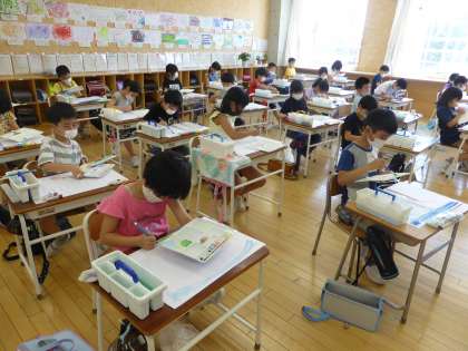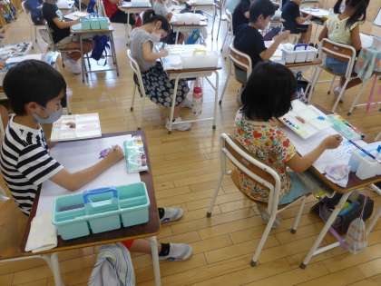 図画工作科では、6月を感じるものをイメージし、水彩画で表現しています。