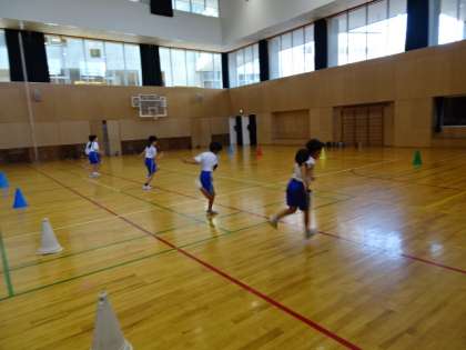 体育館で体つくり運動にチャレンジしています。体育館の床の線の上を綱渡りのようにして移動するゲームや、音楽に合わせたストレッチなどで体と心ほぐした後、いろいろな動きで折り返しリレーをしました。