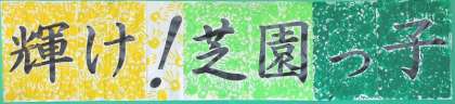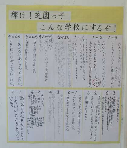 6年生が意見を出し合って考えた児童会スローガン『輝け!芝園っ子』の掲示は、6年生全員の手形で彩られています。よりよい学校にしたいという最高学年の思いが込められています。