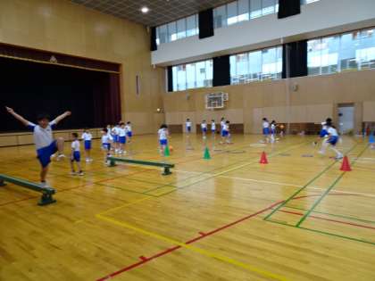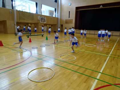 体育館で、平均台コース、ジグザグドリブルコーズ、川跳びコースなどいろいろなコースをつくって運動に挑戦しました。フラフープとケンステップを使って、ハードル走のリズムを確かめるコースでは、歩数や歩幅を考えながらリズムよく跳べるように意欲的に練習していました。