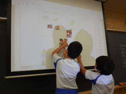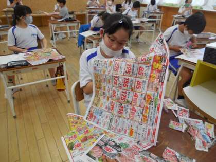 今日の社会科の学習は、スーパーマーケットのチラシを見ながら、何がどの県から届いているかを調べました。富山市のスーパーに届く食料の産地が全国各地に散らばっていることや、外国産が多いことなどに気付きました。