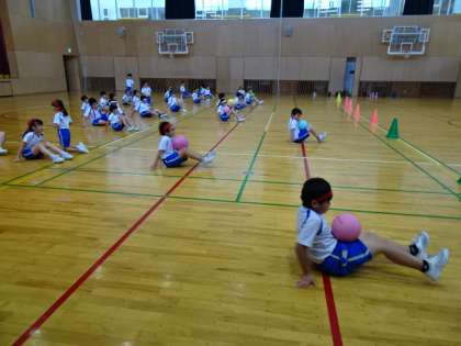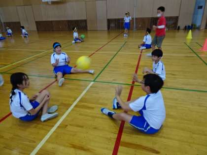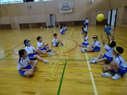 総合的な学習でパラリンピックのシッティングバレーという競技について学習しました。それを元に、実際に体験してみました。座ったままボールを運んで折り返しリレーをしたり、円陣になってパスをしたり、対面でラリーの練習をしたりしました。おしりを浮かせてはいけないので、座ったまま動くことの難しさを感じながらも、楽しく体験しました。