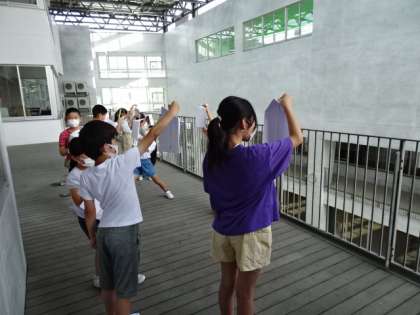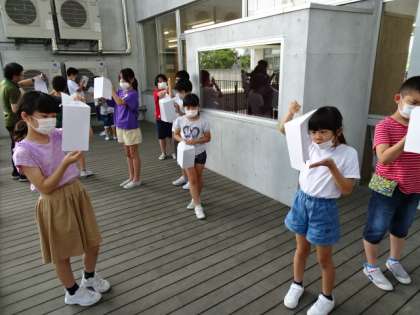 理科「天気の気温」の学習で、一日の気温の変わり方を調べました。直接日光が当たらないように覆いを温度計に付けました。どんな風に気温が変わるか楽しみにしながら一時間おきに気温を測り、表にまとめました。