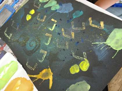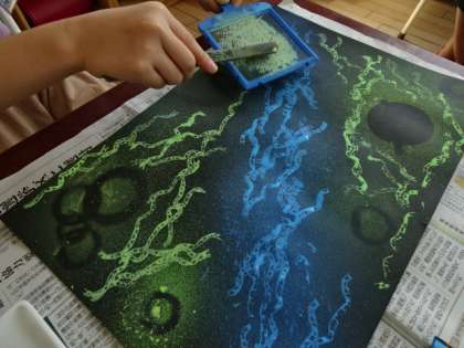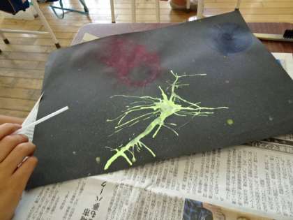 友達の作品の工夫やよさを参考にしながら、自分の作品をパワーアップさせました。「自分の作品は全体的に暗いから、明るい所をつくろう」「○○さんの段ボールで描いた模様がおもしろいな、自分も工夫してみよう」と、考えを巡らせながら作品づくりに取り組んでいました。出来上がると「前より、よくなってうれしい」と満足気でした。