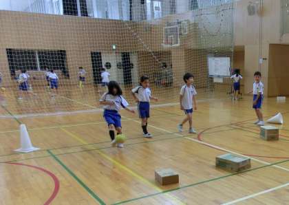 段ボール箱の的を目がけてボールを蹴る練習をしたり、色団で対戦をしたりしています。蹴り方やコントロールが、だんだん上手になってきました。