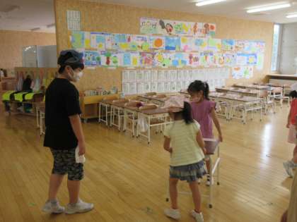 1年生は、机と椅子の運び方を知り、自分たちで動かせるように練習しています。